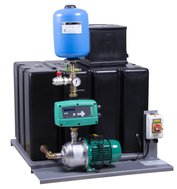 1 MHI non self-priming horizontal stainless steel high pressure centrifugal pumps with integrated frequency converter that enables variable speed control. The pump has a 1/4 turn ball valve on suction and a 1/4 turn ball valve and a non-return valve on discharge. The discharge manifold is equipped with an 8 litre diaphragm pressure vessel with through-flow fitting to DN 4807, pressure gauge, air vent and integrated pressure sensor. Low level float switch installed inside the tank.