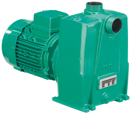 Self-priming drainage pump for the transportable and stationary dry well installation for pumping clean and lightly contaminated water. Hydraulics with a horizontal suction connection and a vertical pressure connection and threaded connection. An inspection opening on the hydraulics facilitates the cleaning of the impeller and the pump housing. A multi-channel impeller is used as the impeller. Hydraulics and impeller made of cast iron. Drive is provided by a three-phase current version standard motor that features a motor housing made of aluminium. The connection cable must be provided by the customer. The hydraulics and motor have a common shaft. Stable installation is carried out using a low-vibration baseplate.