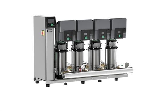 Compact pressure-boosting system according to DIN 1988 and DIN EN 806, for direct or indirect connection. Consisting of non-self-priming, connected in parallel, vertically-mounted stainless steel high-pressure multistage centrifugal pumps in glanded versions, for which each pump is fitted with a frequency converter. Ready for connection with stainless steel pipework, mounted on a base frame, including control device with all necessary measurement and adjustment equipment.